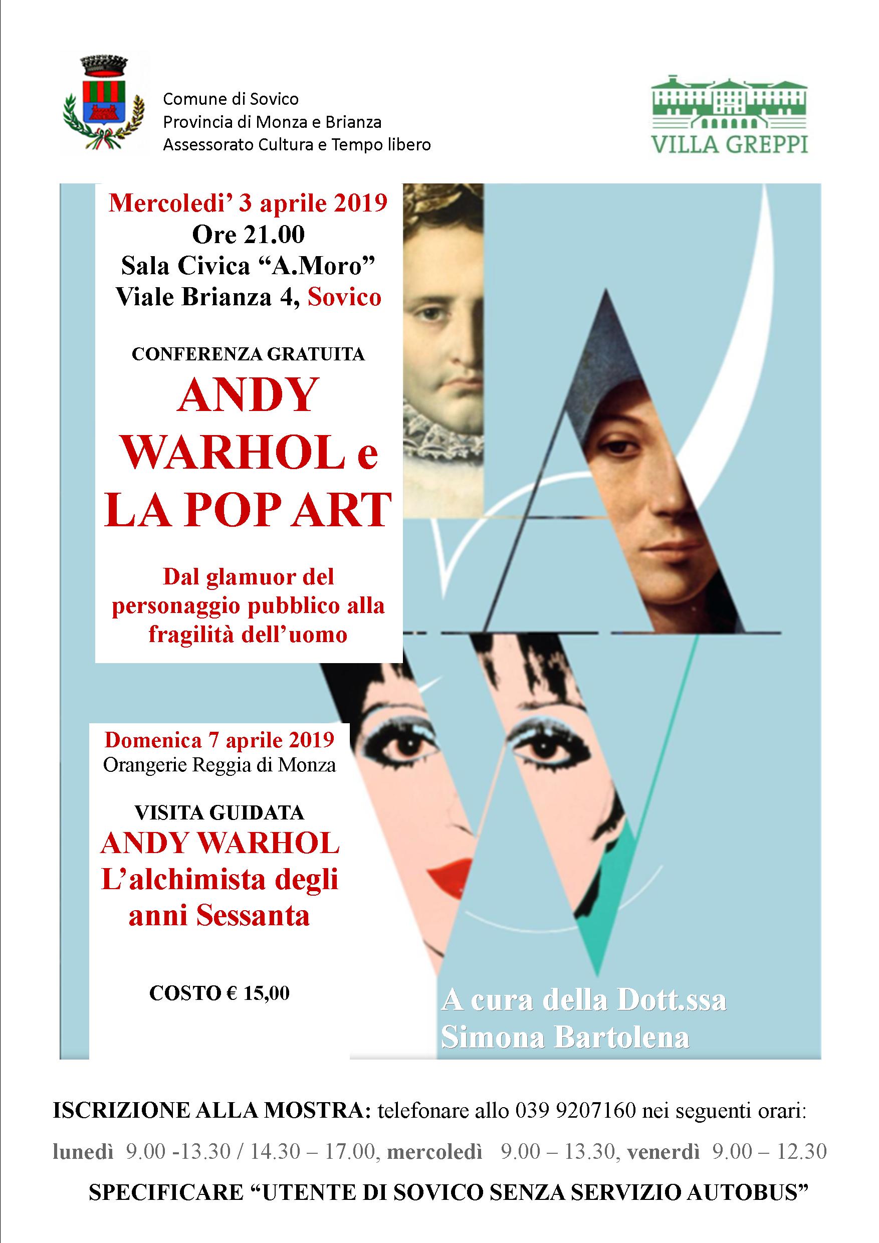 Mercoledì 3 aprile 2019, alle ore 21,00 presso la Sala civica A. Moro si terrà l’incontro gratuito “Andy Warhol e la pop art. Dal glamour del personaggio pubblico alla fragilità dell’uomo” a cura di Simona Bartolena. Seguirà domenica 7 aprile la visita guidata alla mostra ospitata presso l’Orangerie della Reggia di Monza. L’iniziativa è organizzata in collaborazione con il Consorzio Villa Greppi.