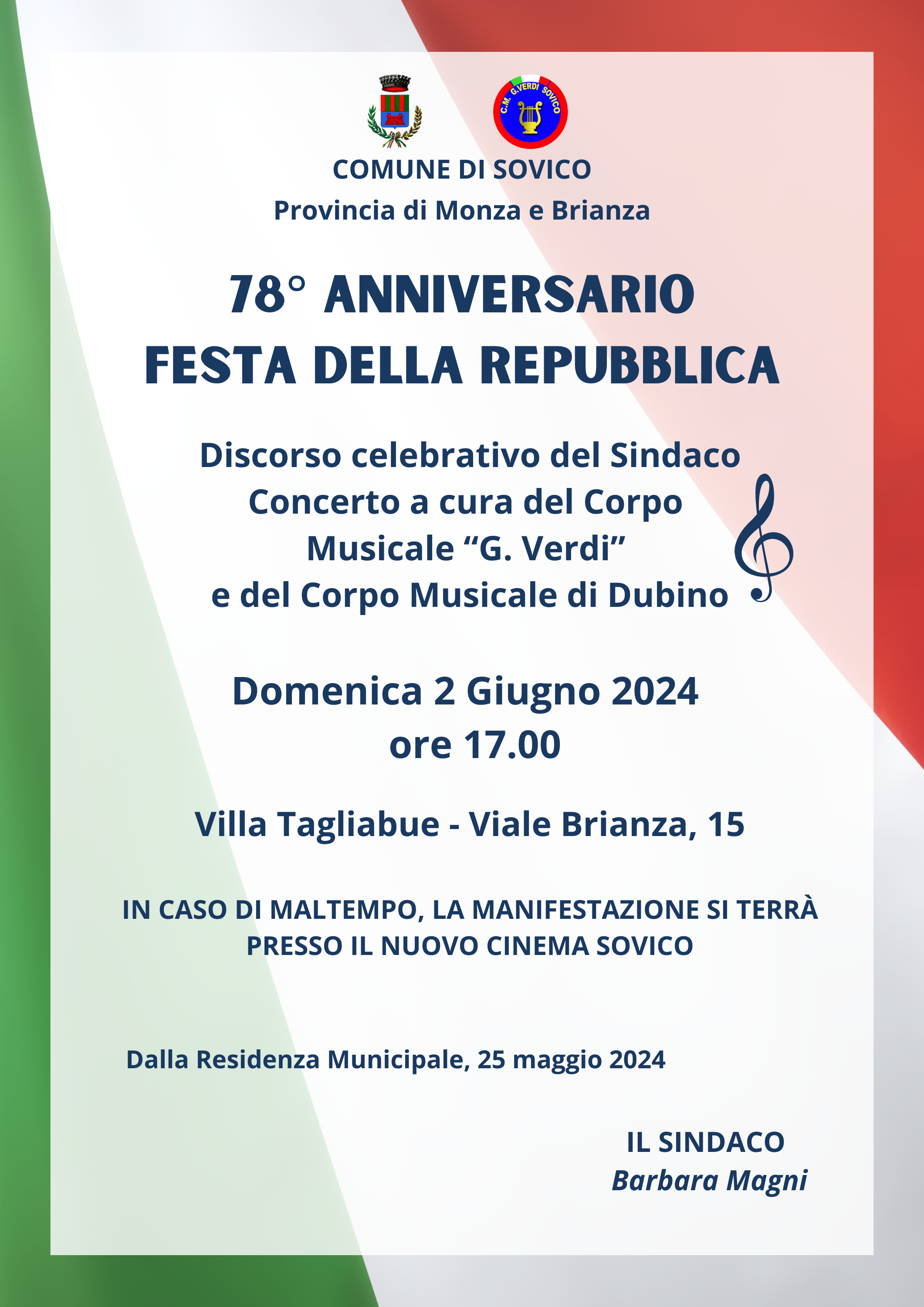 In occasione del 78° anniversario della Festa della Repubblica, DOMENICA 2 giugno 2024 alle ore 17.00 presso la Villa Tagliabue sita in Viale Brianza 15 si svolgerà il concerto del Corpo Musicale “G. Verdi” di Sovico e del Corpo Musicale di Dubino.