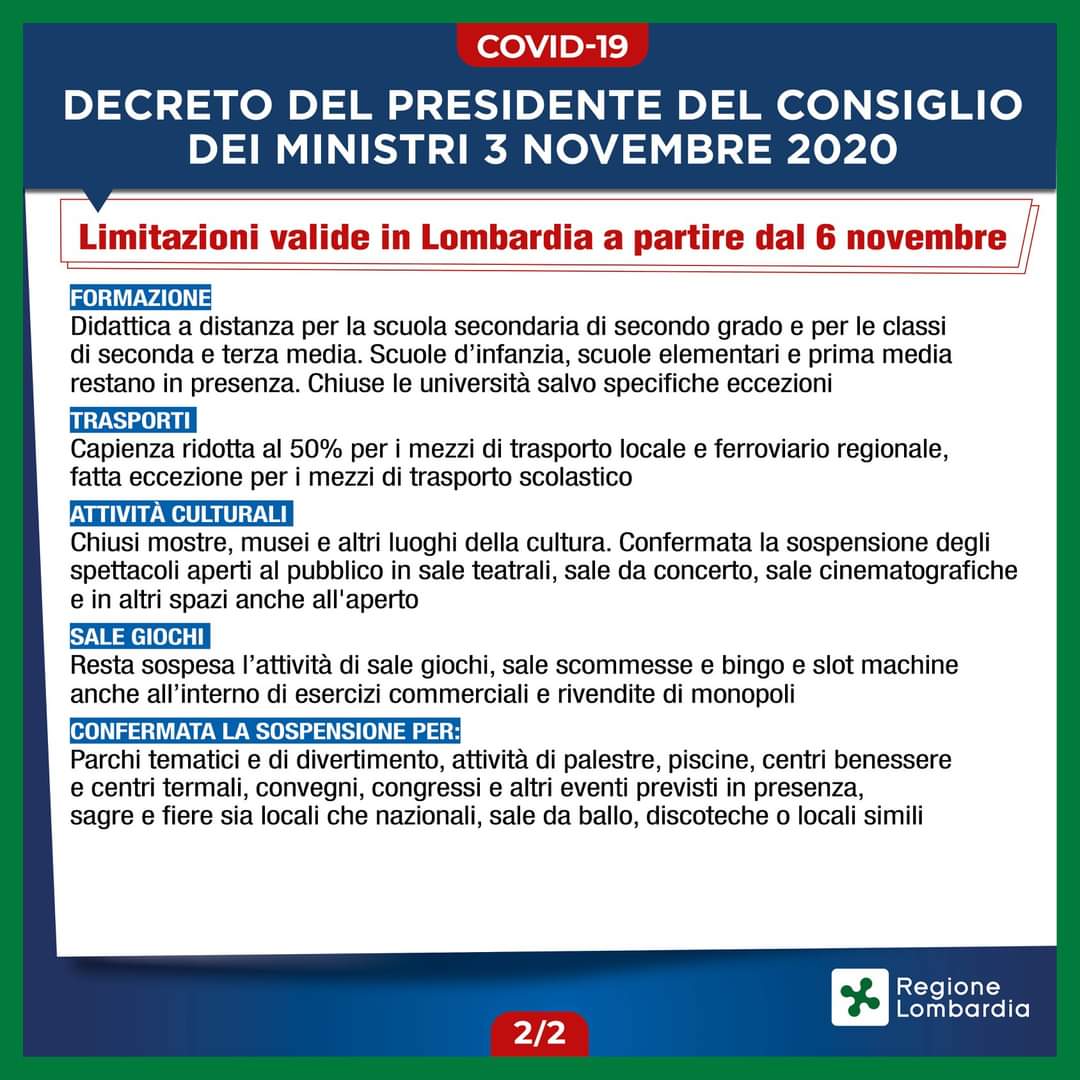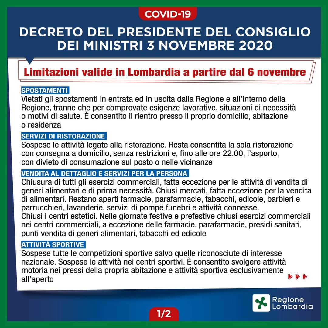Si pubblicano, in allegato, le limitazioni valide in Lombardia dal 6 Novembre 2020 a seguito del D.P.C.M. del 3 Novembre 2020